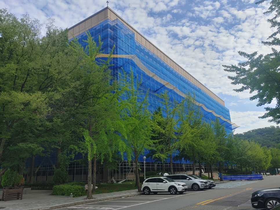 수직보호망을 건물 외벽에 있는 비계에 수직으로 설치하여외관상 매우 깔끔해진 모습을 보실 수 있습니다 사진에서 보시는 바와 같이 빈틈없이 견고하게 설치가 가능하여 작업 현장에서 발생할 수 있는 먼지나 폐기물들을 막아주고 안전문구나 로고 등을 인쇄할 수 있어 외부에서도 쉽게 현장을 구분할 수 있게 도와줍니다.
