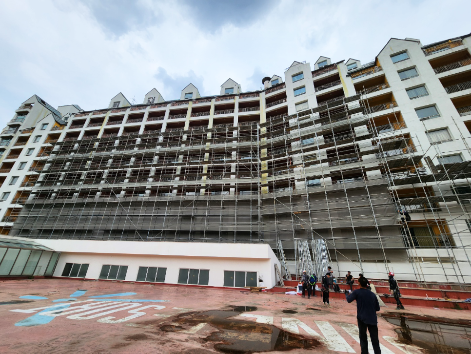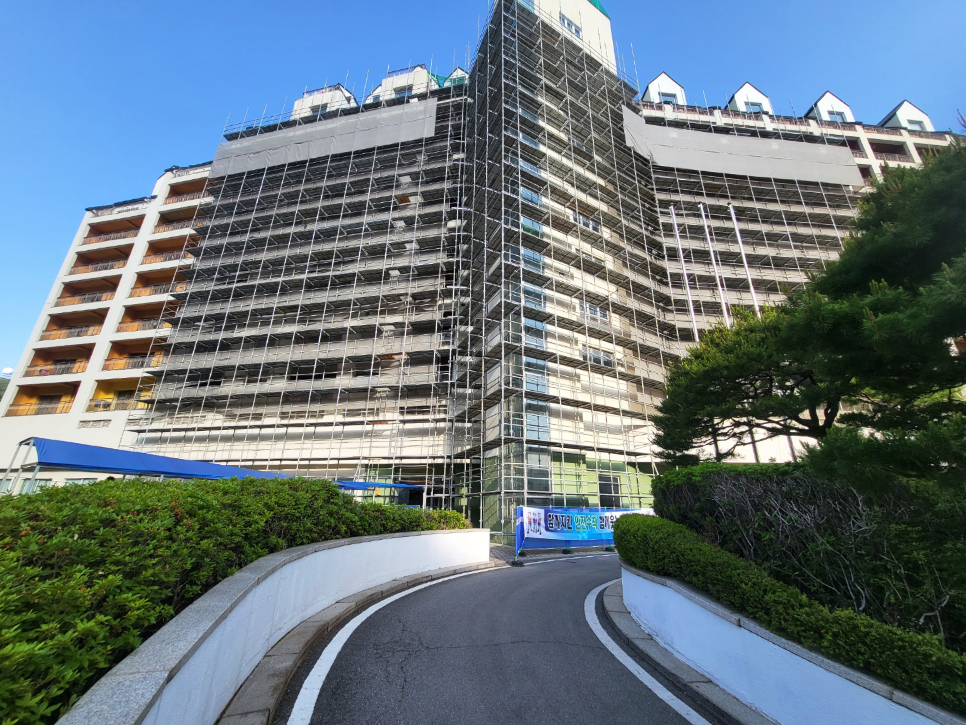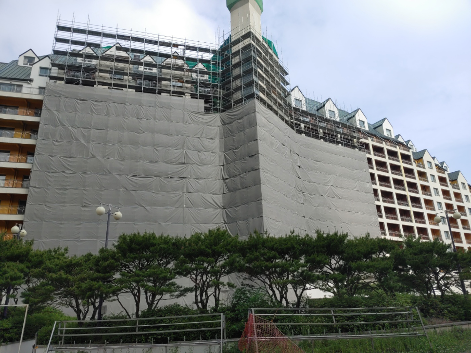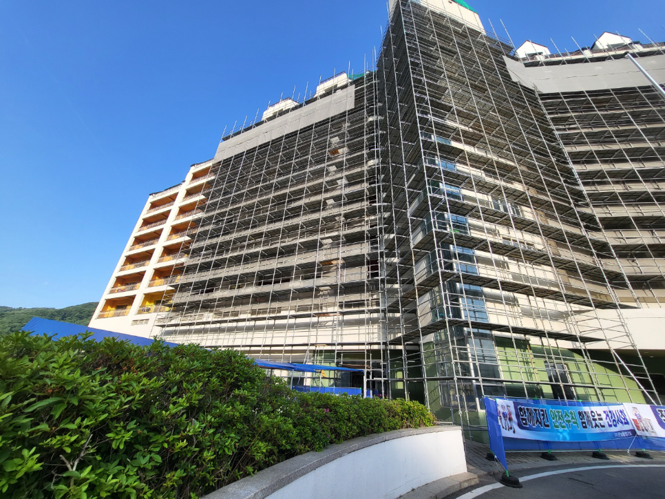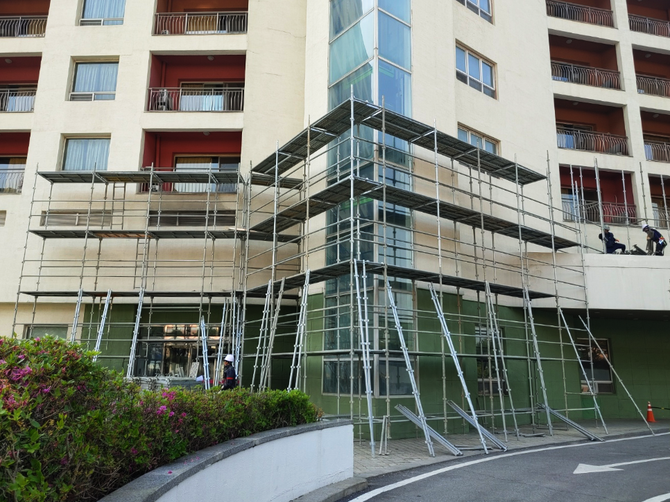 2023년 05월 시공현장으로 총 11층 높이 리조트 건물 시스템비계를 설치하였습니다.