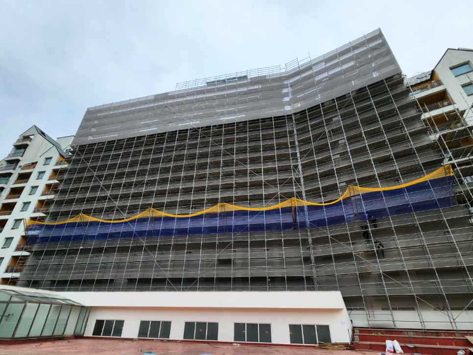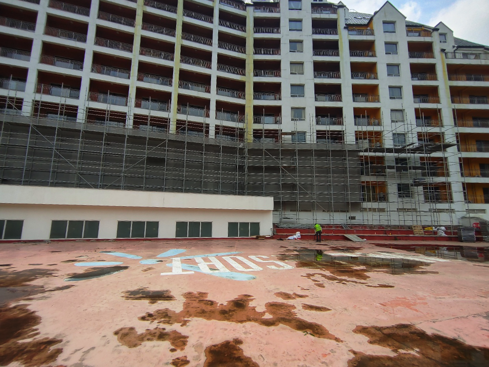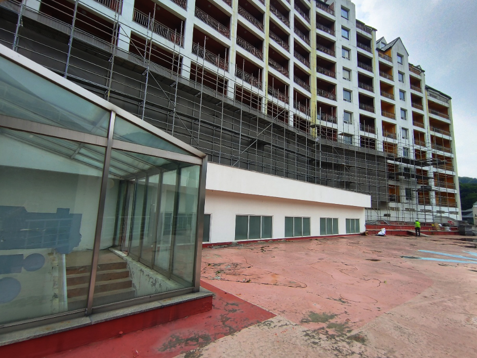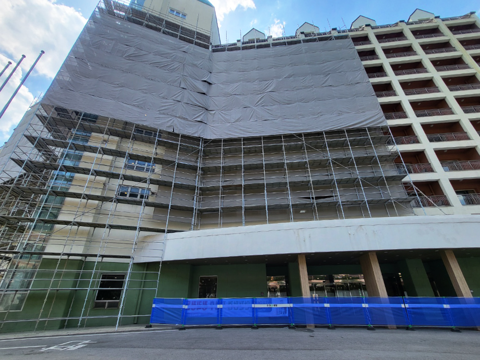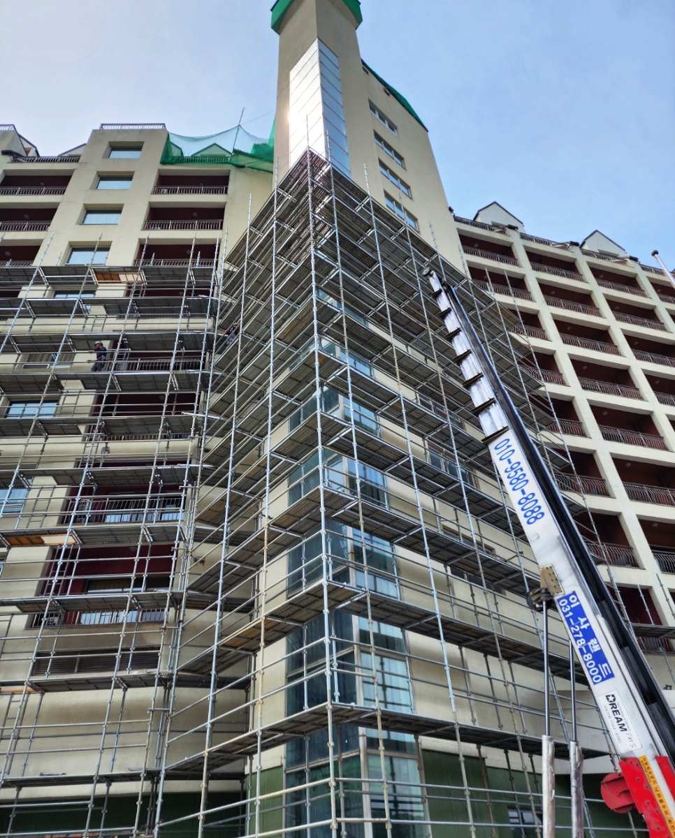 2023년 05월 시공현장으로 총 11층 높이 리조트 건물 시스템비계를 설치하였습니다.