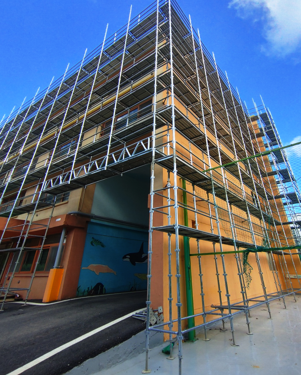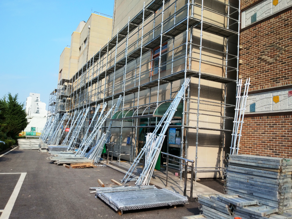 학교 외부 전체에 시스템비계를 시공하고 있는 중입니다 작업 목적이 외벽 전체 수리를 위한 설치 이므로 지붕 끝 모서리